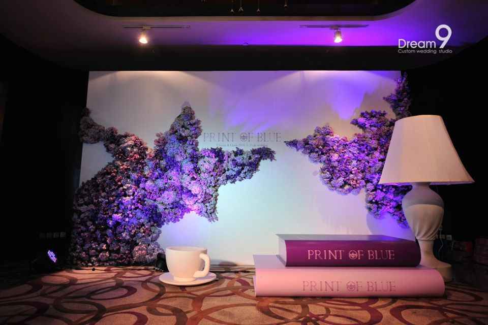 迎接宾客的是摇曳着点光源的暖暖前厅。窗前繁花正好,成千万朵的花骨朵被用以造型一片渐变的地图形状。我们知道,那是她喜欢的,规整而不失细节。整个场景都仿佛是在家的一个角落,光线不强的窗前,一杯咖啡一本书,安静而又细致地述说着幸福的小故事。