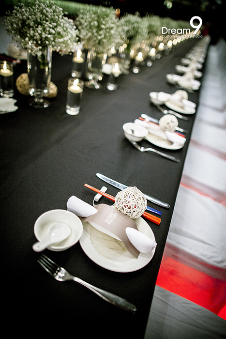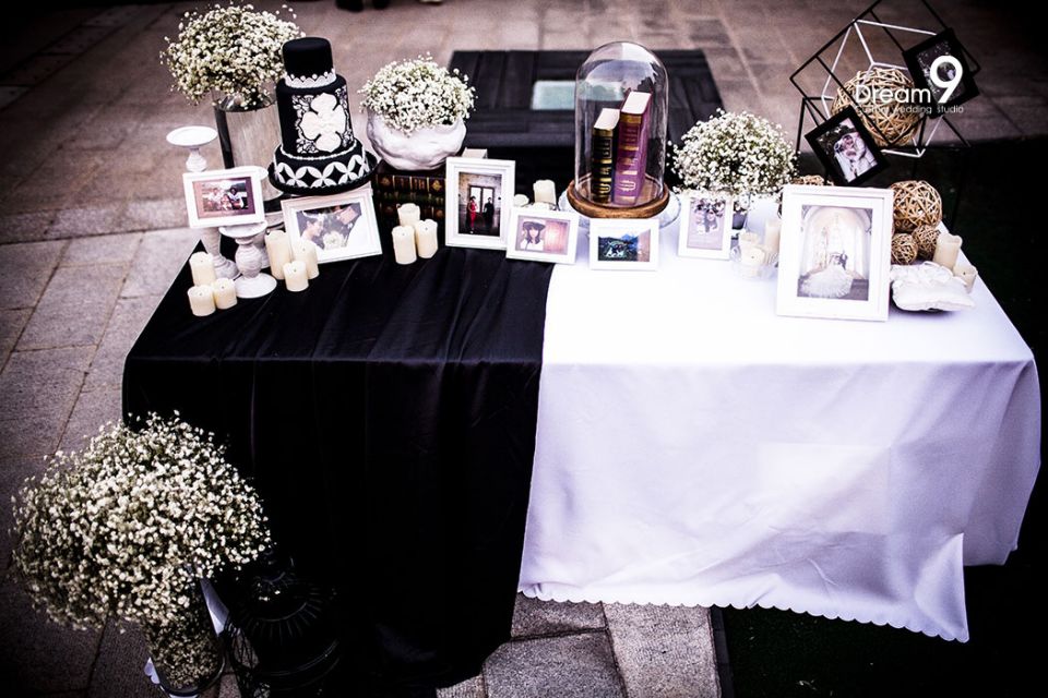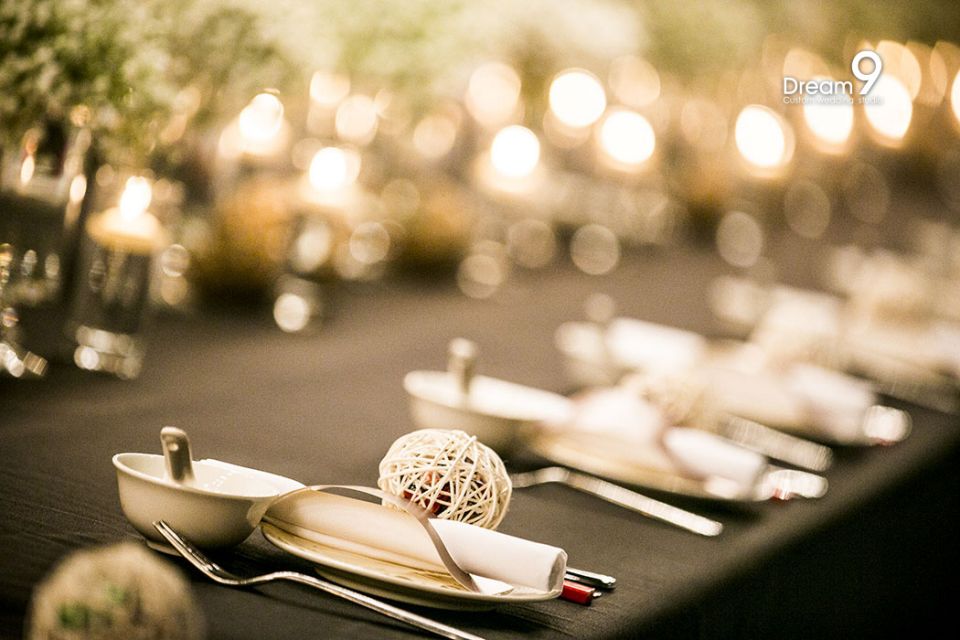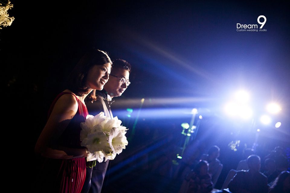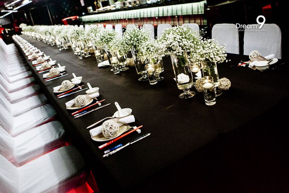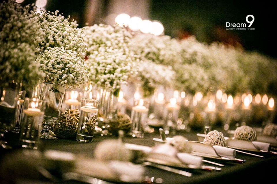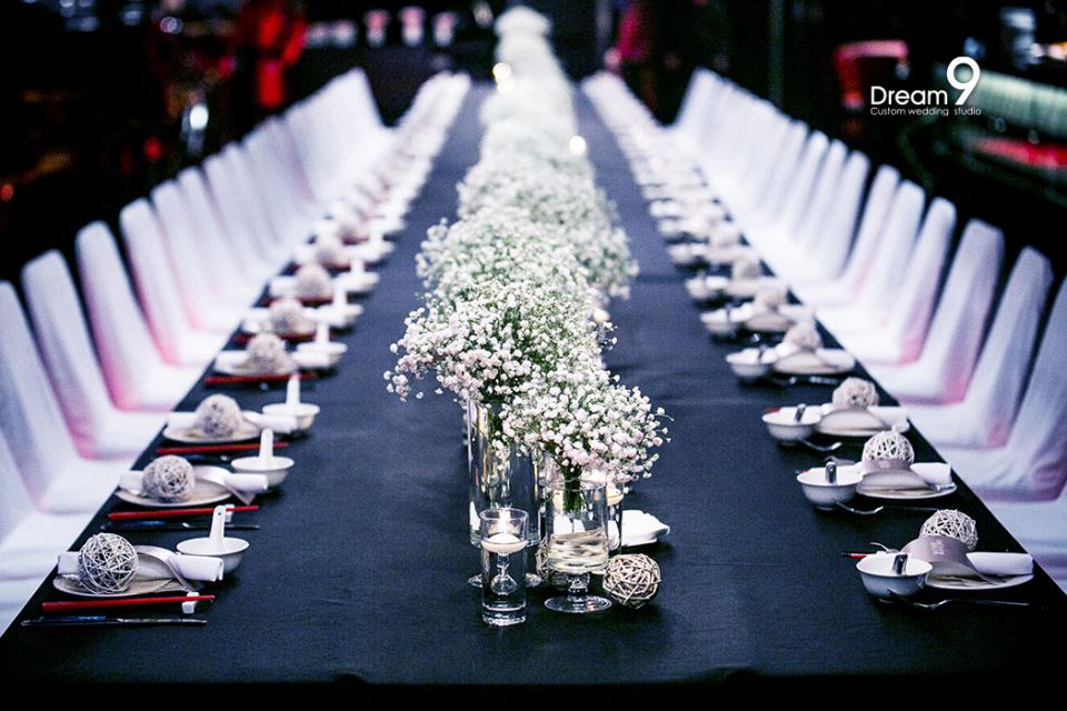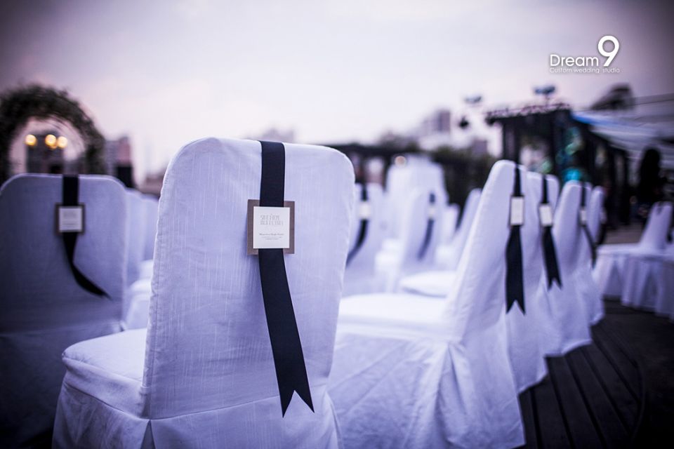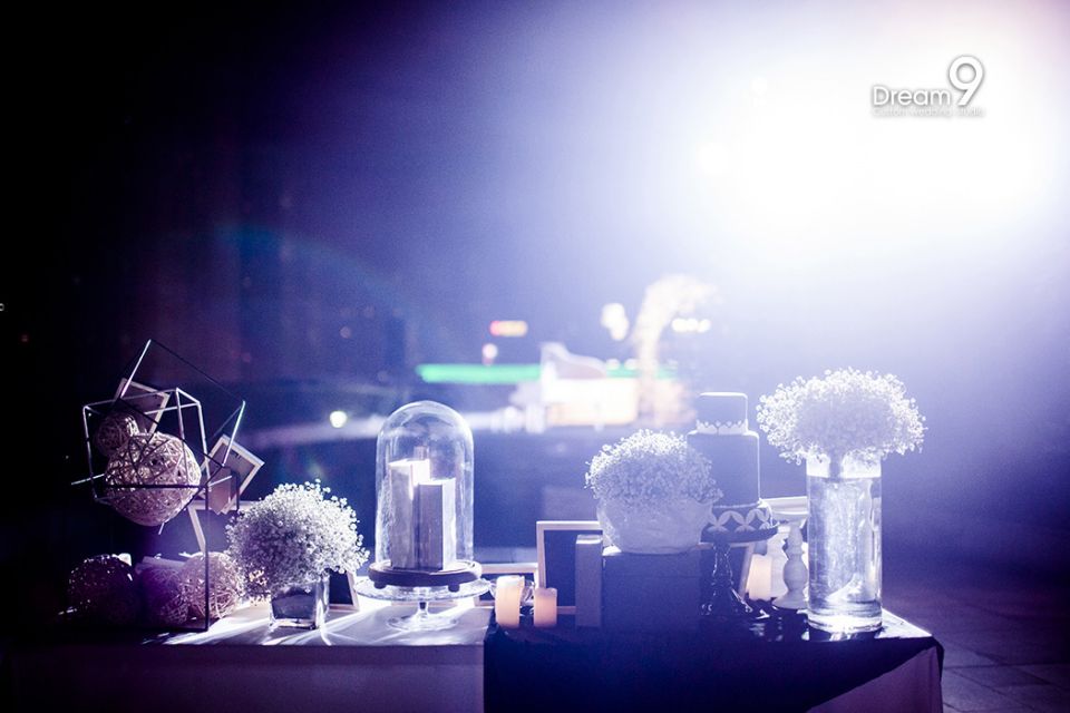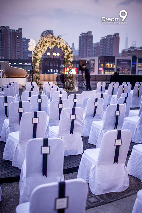 夜色下的露台婚礼本就具有天然的浪漫感觉,而黑白配色的直观组合透露更多的是爱的本质。清纯、浪漫、素雅的满天星是整个夜晚的亮色调,带着爱与温情的物件都有了各自的生机,葡萄架走廊点亮盏盏简约风复古吊灯,条形元木与沁绿丝带传出斑斑驳驳的点光源,营造出星空般的氛围。