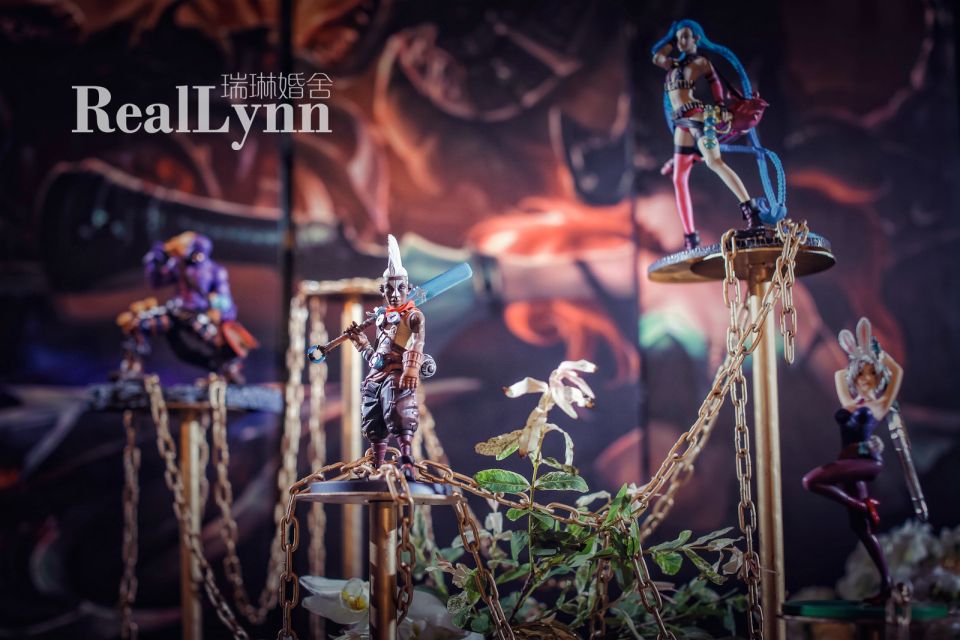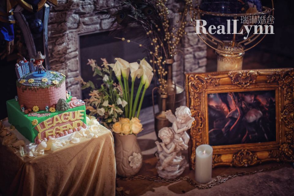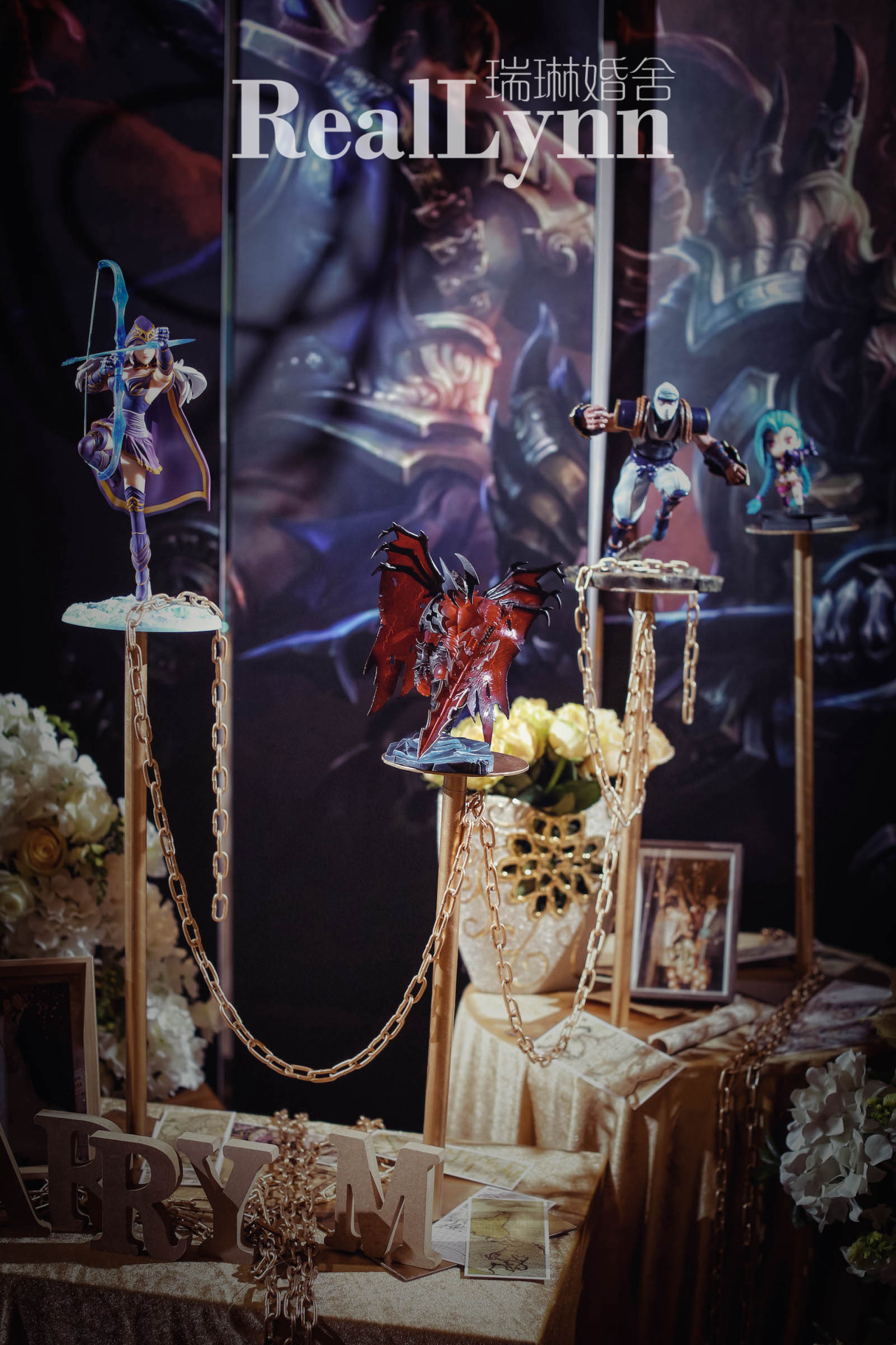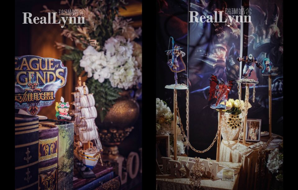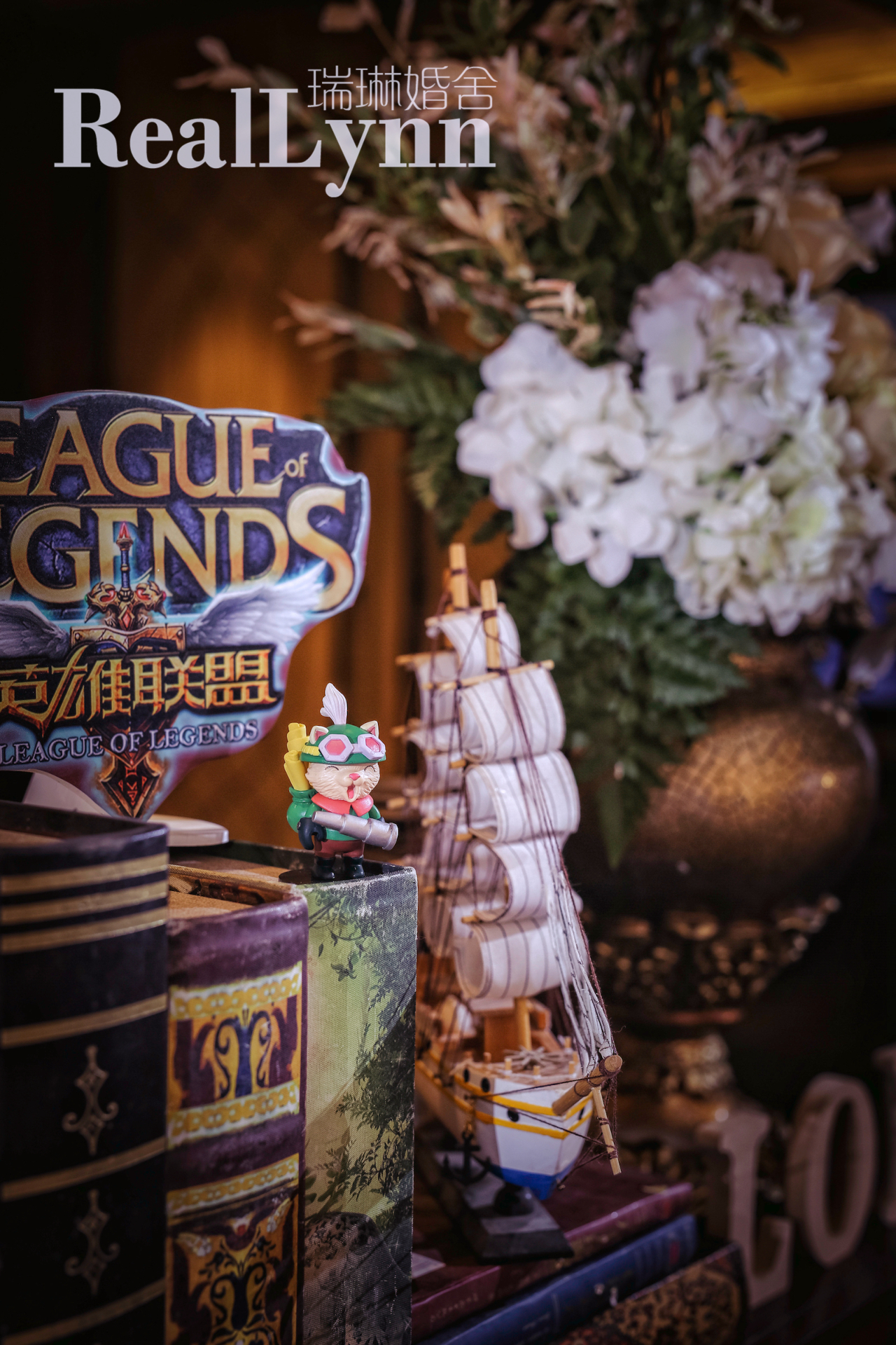这是一场以英雄联盟为主旋律的婚礼,新郎新娘虽然不是以这款游戏结缘,却因德玛西亚的力量,恋情得到了维系和升华。在lol婚礼中,我们随处可见里面的游戏人物,盔甲,蛋糕等等。再结合残垣断壁的合影背景,这也是游戏中的召唤师开始的出生地,借此寓意着新人从今天开始有着繁花似锦的璀璨未来。
