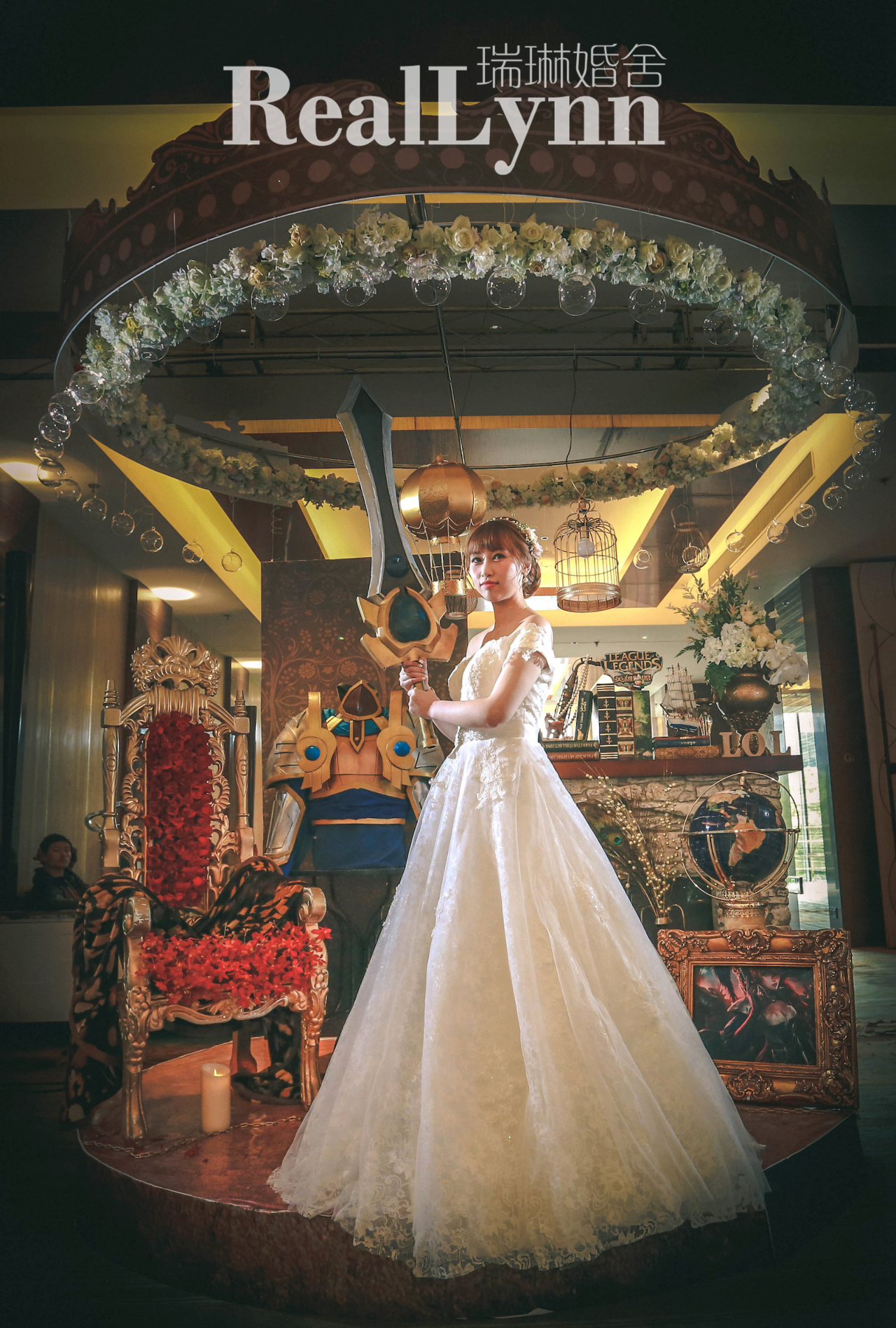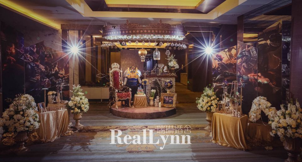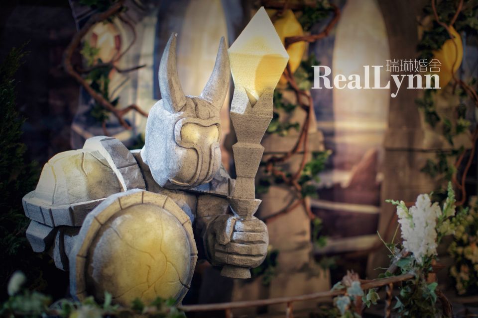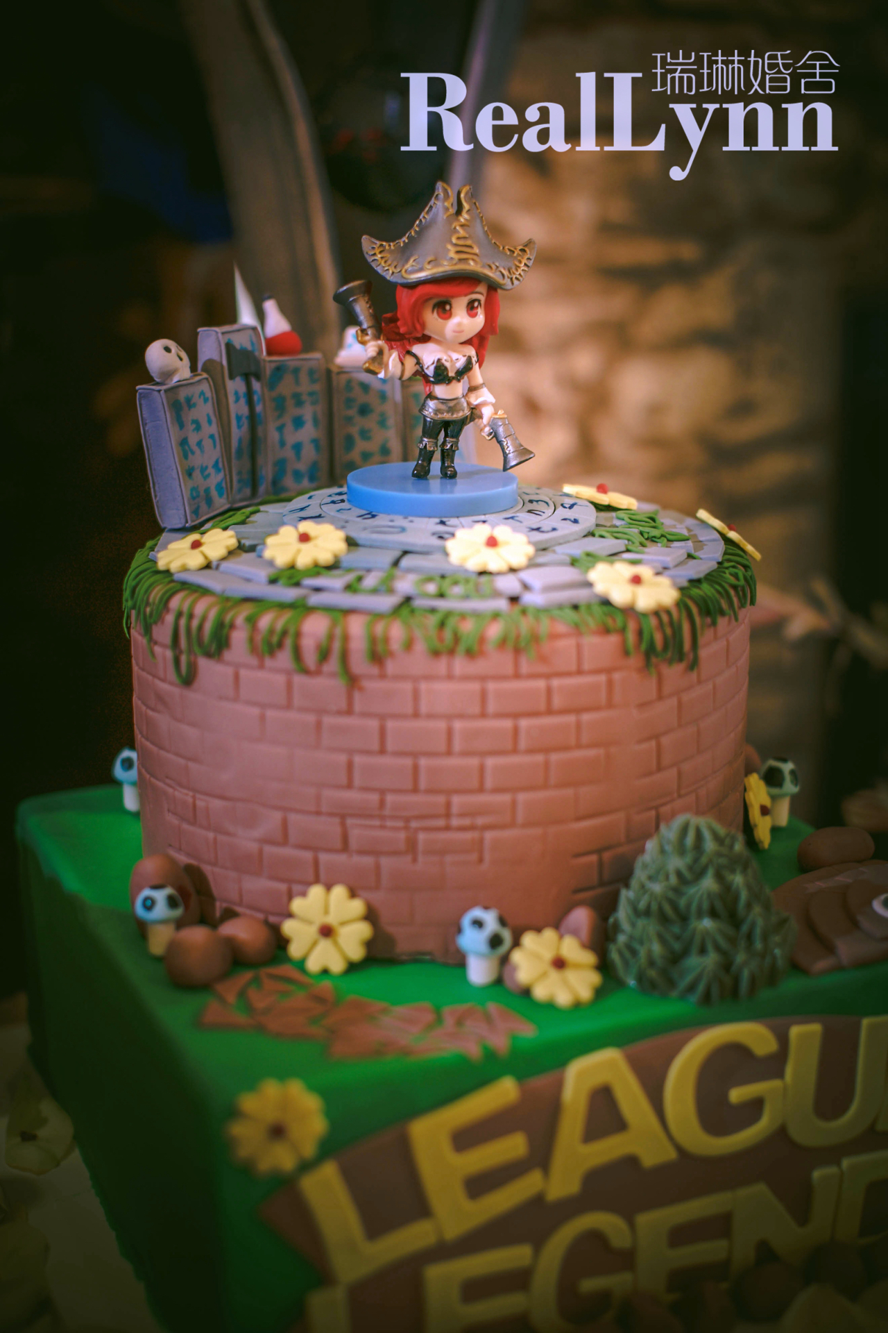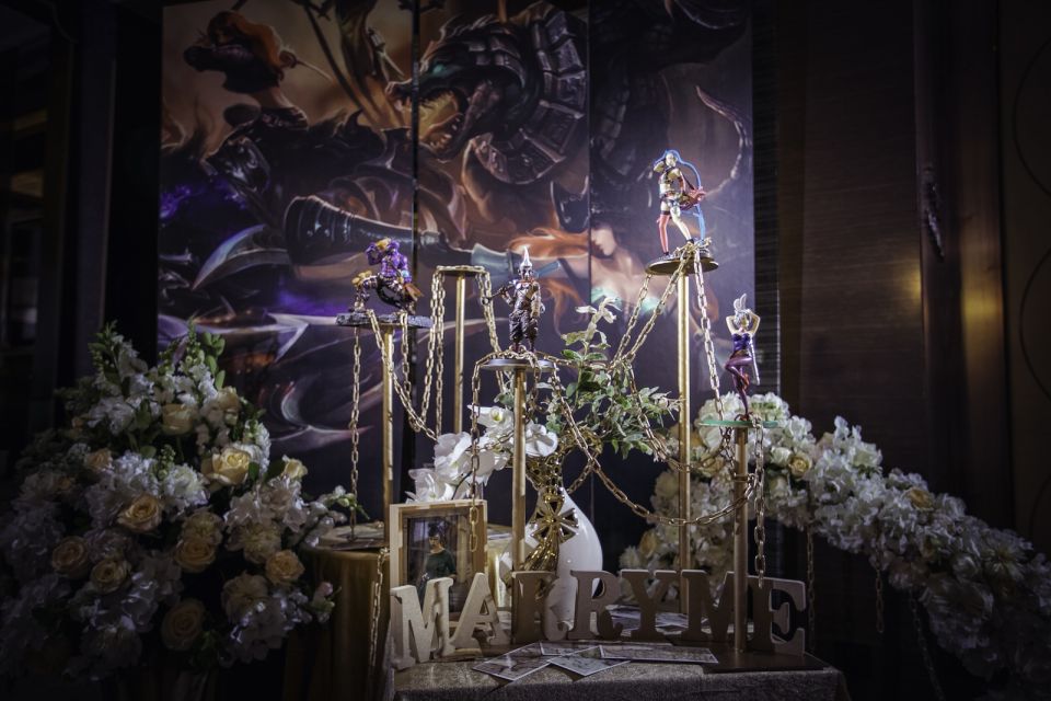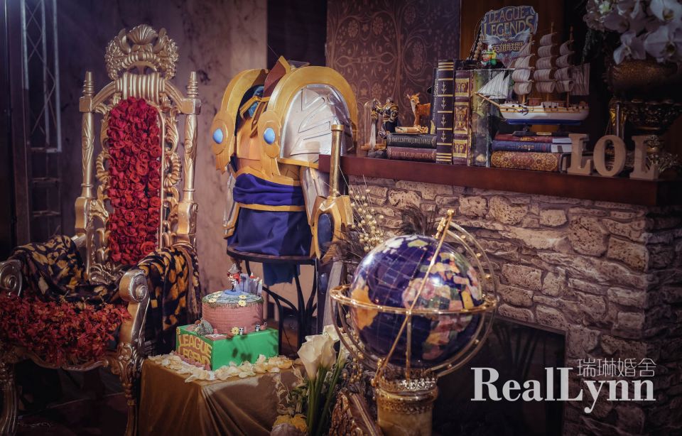 这是一场以英雄联盟为主旋律的婚礼,新郎新娘虽然不是以这款游戏结缘,却因德玛西亚的力量,恋情得到了维系和升华。在lol婚礼中,我们随处可见里面的游戏人物,盔甲,蛋糕等等。再结合残垣断壁的合影背景,这也是游戏中的召唤师开始的出生地,借此寓意着新人从今天开始有着繁花似锦的璀璨未来。