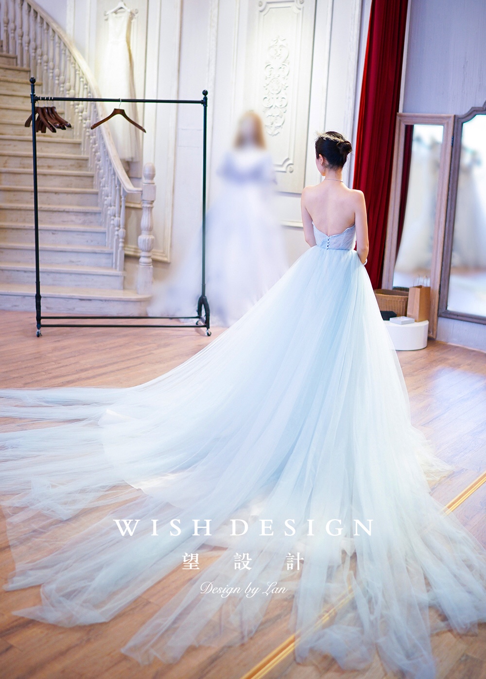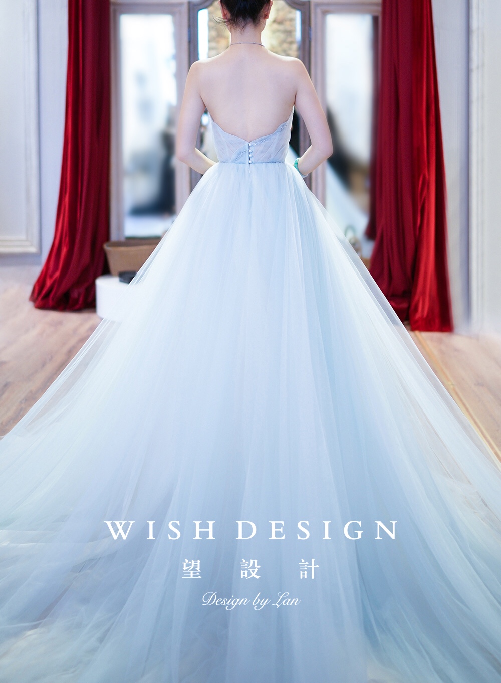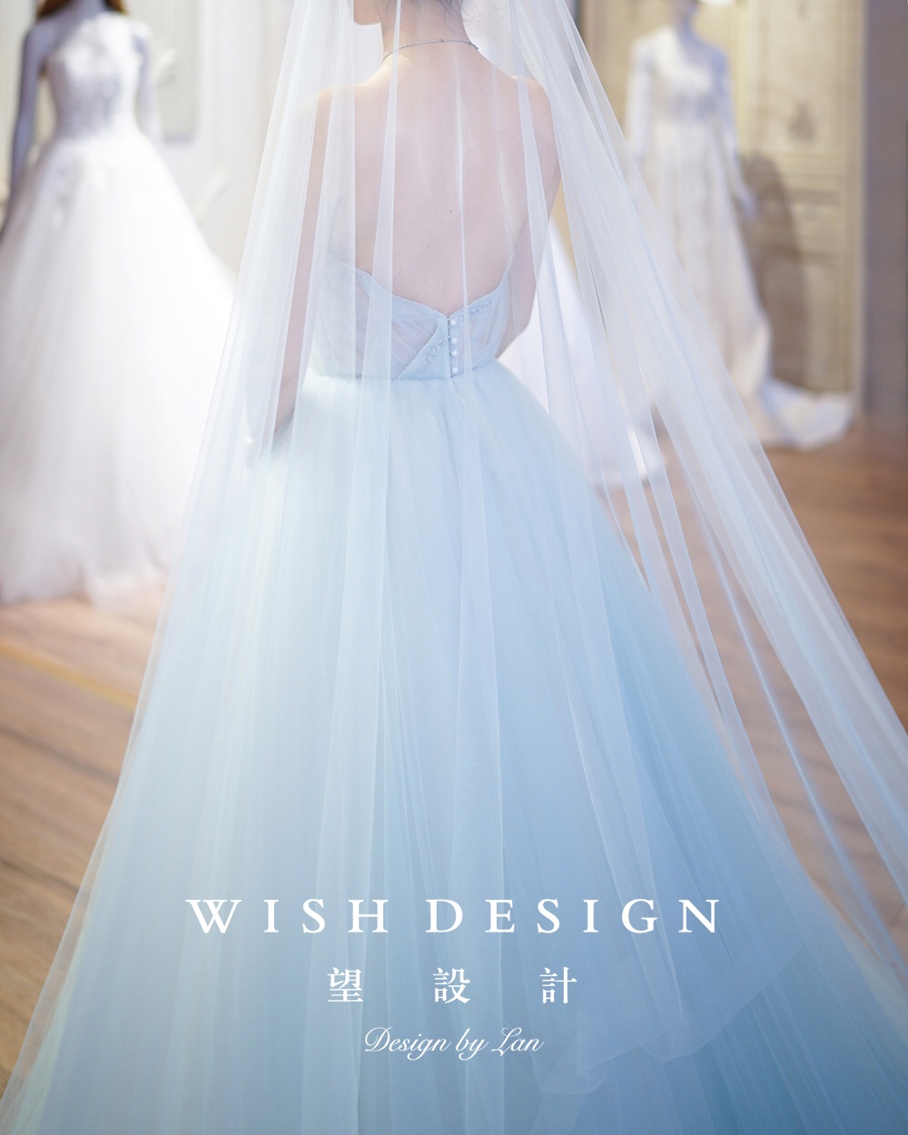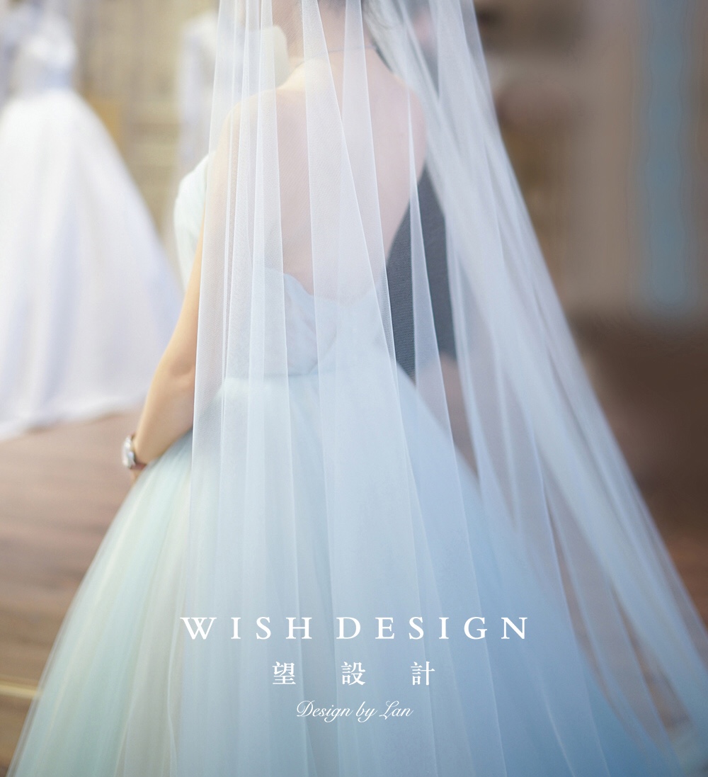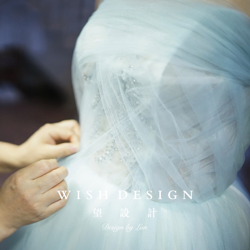 兰奕的纱,海洋女仙。浅色的蓝,含有一种淡淡的清新,似乎还夹杂着海草的味道。好怀念夕阳下的沙滩与海浪。层次的变化,趣味的镂空,如同打开一面窗,通透感与渐变色,经过用心考量的每个细节,保持婚纱的轻盈与挺廓。婚纱设计:兰奕。